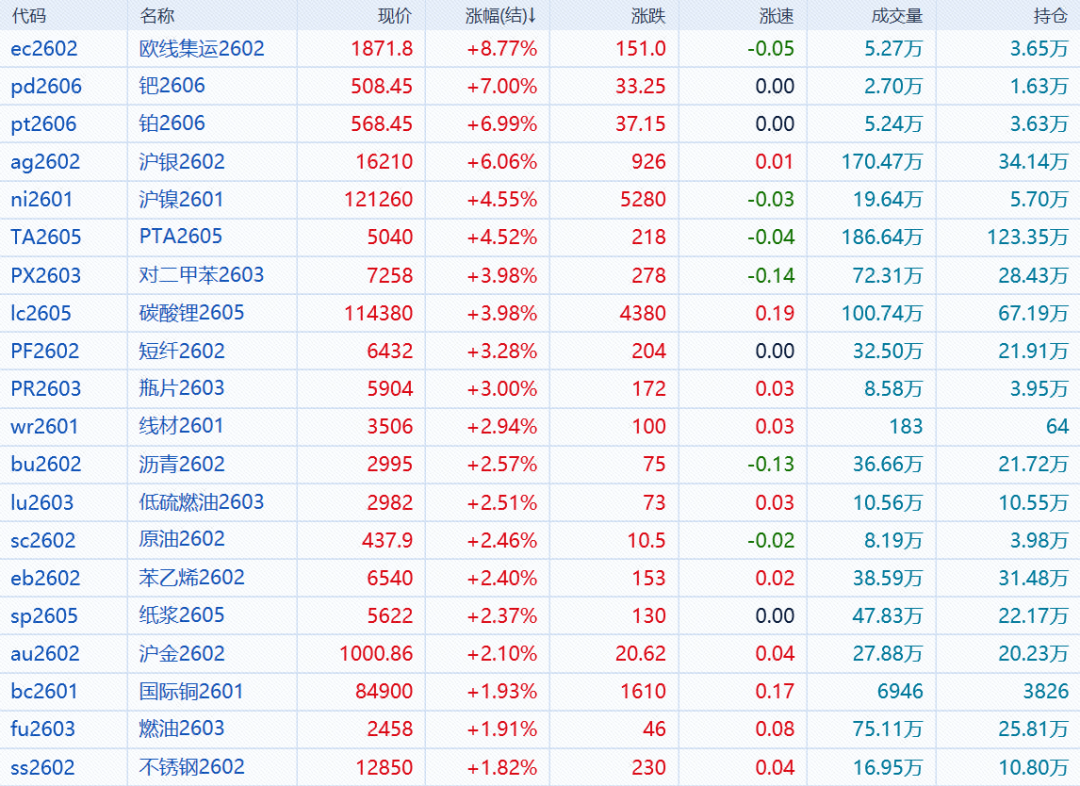 12月22日,午市收盘,国内期货主力合约涨跌互现。集运指数(欧线)涨超8%,广期所钯、铂均封涨停板,沪银涨超6%,沪镍、PTA涨超4%,对二甲苯(PX)、碳酸锂涨近4%。跌幅方面,塑料、多晶硅跌超2%。