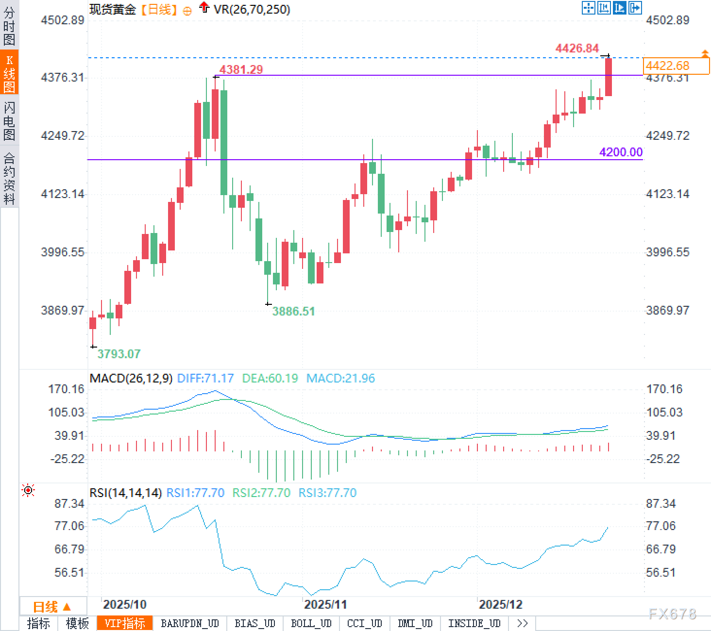 从日线K线图看,价格在突破4400美元后形成“阻力转支撑”的经典结构,前高4381.29美元已转为关键回测位;上方则以4426.84美元附近的最新高点作为短线阻力参考。另一条显著水平位在4200.00美元,代表中期多空分水岭,一旦行情出现更深回撤,4200.00美元更像是趋势交易员关注的“结构性支撑线”,其得失往往决定回撤是整理还是反转。