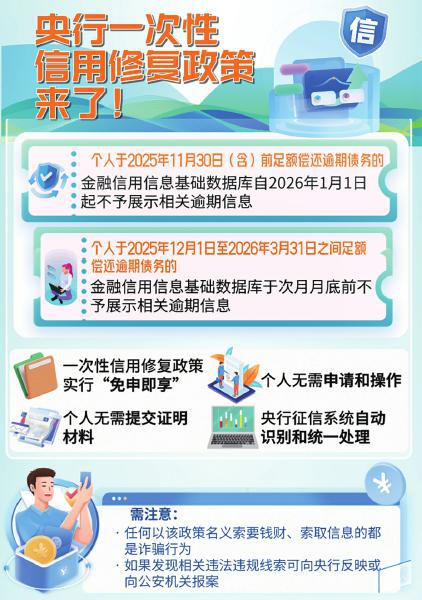 2025年12月22日,中国人民银行(以下简称“央行”)发布《中国人民银行关于实施一次性信用修复政策有关安排的通知》(以下简称“《通知》”)以及相关政策问答,指出为积极应对新冠疫情后续影响,支持信用受损但积极还款的个人高效便捷重塑信用,助力经济持续回升向好,决定实施一次性信用修复政策。