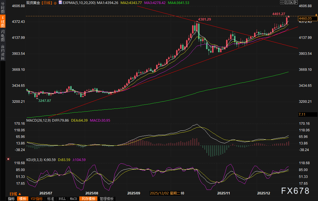 汇通财经APP讯——在2025年岁末之际,全球金融市场迎来一场避险资产的狂欢。黄金价格节节攀高,现货黄金周一(12月22日)刷新历史新高至4449美元/盎司,涨幅超过2.4%,周二(12月23日)亚市早盘,现货黄金延续涨势,截止07:55,再度刷新历史高点至4461.27美元/盎司,美国与委内瑞拉的剑拔弩张、伊朗与以色列的潜在冲突、俄乌冲突的持续,以及美元疲软和美联储降息预期等多重因素的合力,共同给金价提供上涨动能。今年以来,黄金累计上涨逾69%,预计将创下自1979年以来的最大年度涨幅,而白银的表现更是惊人,涨幅已达136%。作为传统避险之王,黄金在当前全球乱局中再度证明其价值,吸引大量资金涌入,推动价格屡创新高。分析师们甚至大胆预测,2026年黄金的目标直指5000美元大关。