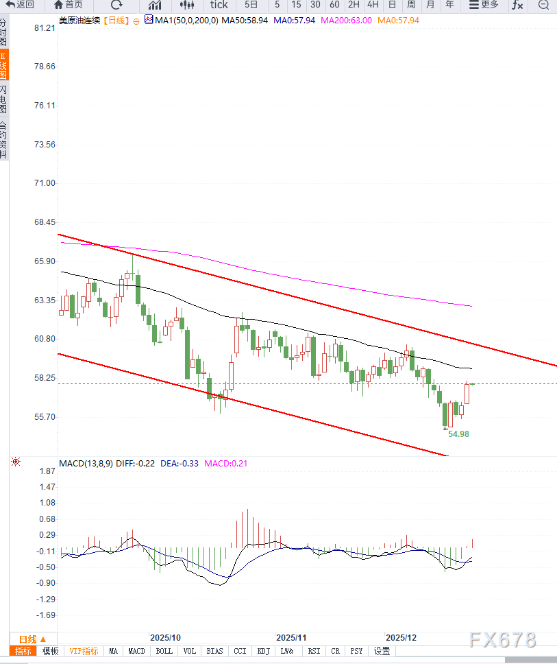 但从整体结构看,WTI仍运行在中期下降通道内,上方60美元—61美元区域对应20日均线与前期密集压力,构成短线反弹的重要阻力。