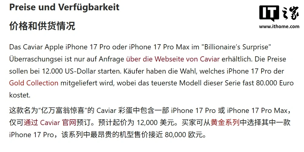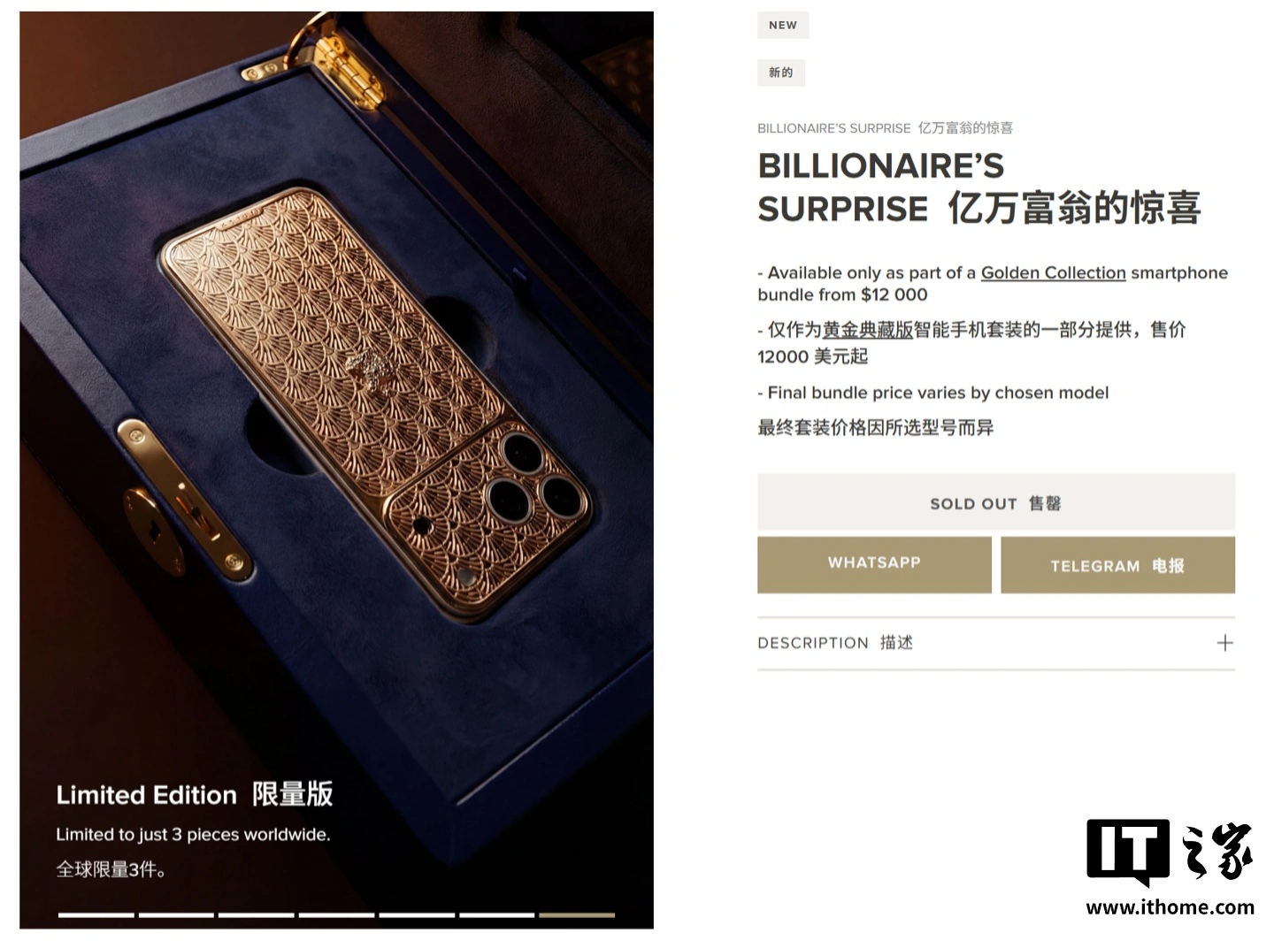IT之家 12 月 23 日消息,奢侈品定制品牌 Caviar 基于苹果 iPhone 17 Pro 和 iPhone 17 Pro Max,推出“亿万富翁的惊喜”(Billionaire's Surprise)系列定制版,再次打破手机定价天花板,顶配版售价逼近 8 万欧元,全球限量 3 件,目前已经售罄。
