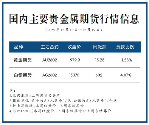| 国内主要贵金属期货行情信息(2025年12月12日—12月19日) 注:1.数据来源:上海期货交易所 2.报价单位:黄金为元(人民币)/克,白银为元(人民币)/千克 3.较上周涨跌:本周收盘价-上周末结算价 4.涨跌比例:(本周收盘价-上周末结算价)/上周末结算价 |
