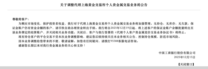 而近期工商银行也发布公告,宣布从12月19日起,关闭“无持仓、无库存、无欠款、保证金账户仍有资金余额的客户”的相关业务功能,以及资金转出手续。此外,光大银行也在官网公告,自12月20日起,对签约代理上金所现货及延期业务且无持仓的客户,将通过系统调整逐步解除业务委托关系。