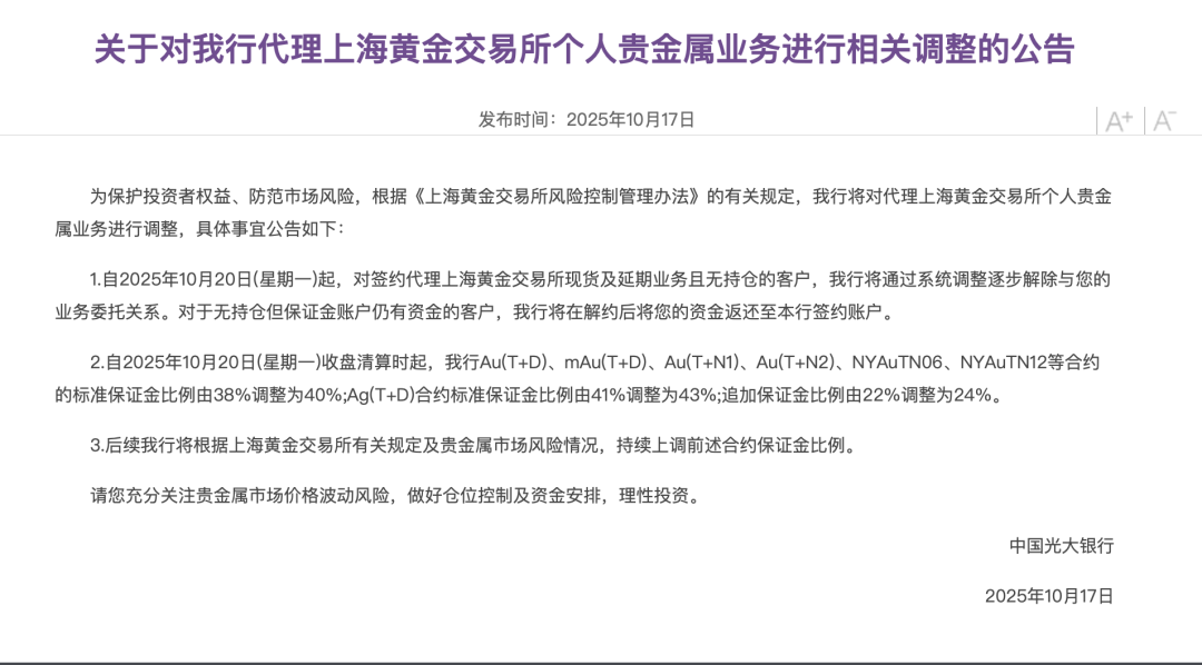 光大银行近期公告显示:根据贵金属市场风险情况,持续上调合约保证金比例。