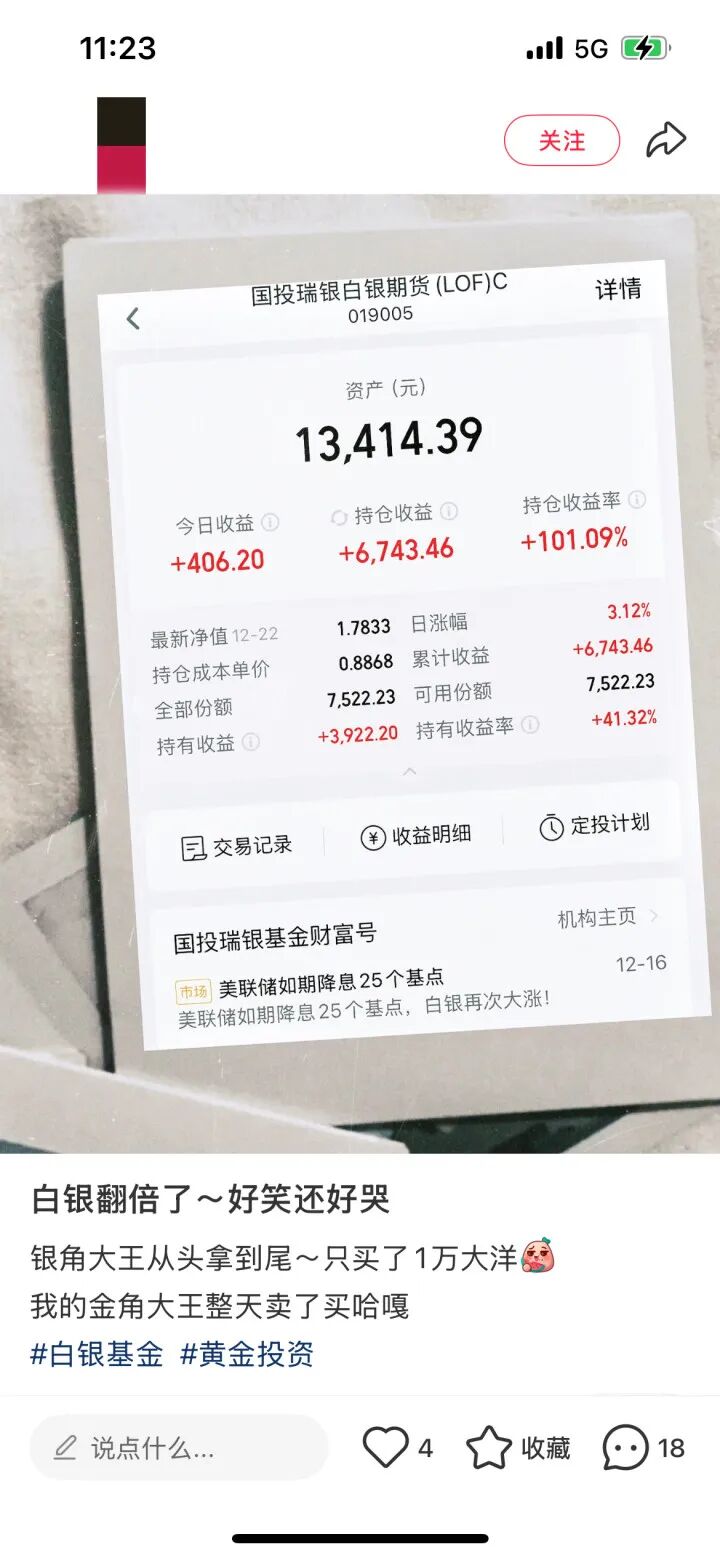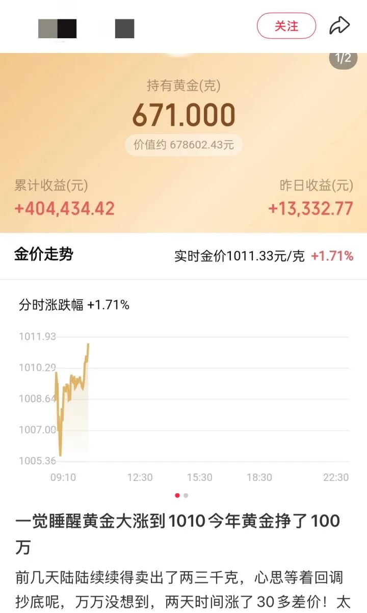 “一觉睡醒黄金大涨到1010,今年黄金挣了100万”,早上,一位博主晒出今年持有黄金的收益情况。