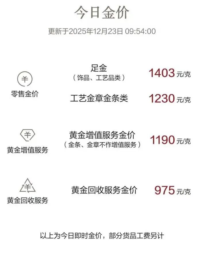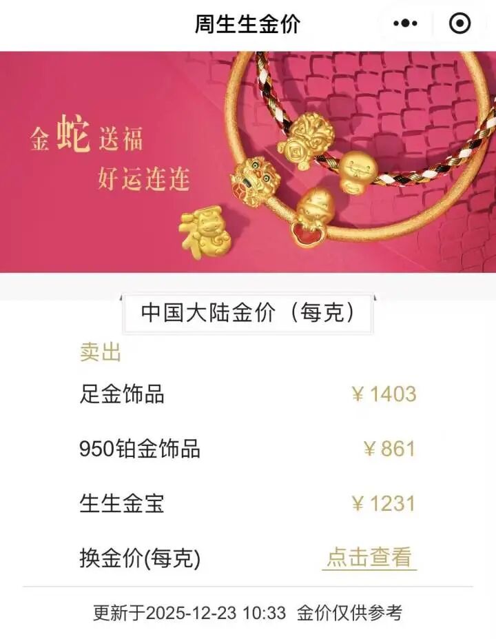 在经历了一夜暴涨后,刚刚,周大福、六福珠宝、周生生等品牌相继更新了最新报价,其中周大福和周生生足金首饰报价1403元/克,每克分别上涨35元和36元。