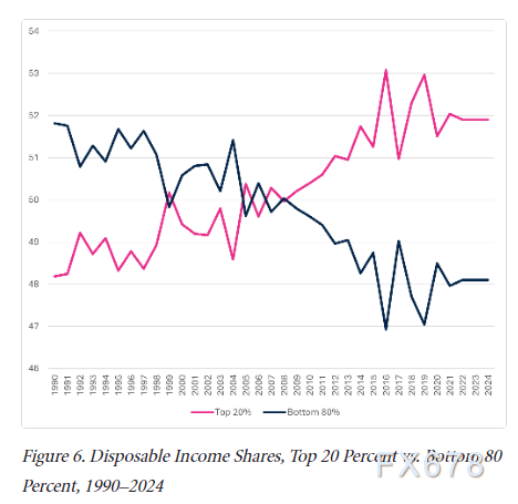 另一方面推动收入向资本端转移,高财富家庭通过利息收入与资产增值扩大优势,截至2024年,顶层20%家庭已掌握超过50%的可支配收入。