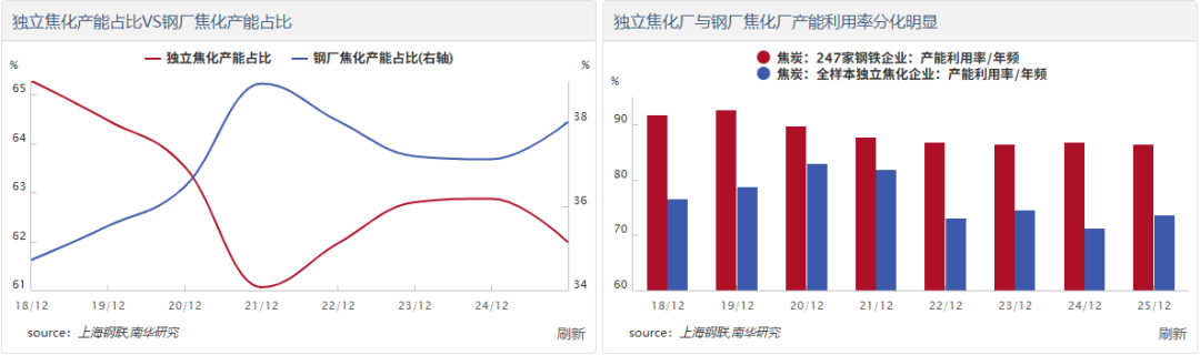 对焦企类别进行细分可以发现,凭借稳定的内部需求和一体化渠道优势,近年来钢焦联营焦企的产能利用率显著高于独立焦企,这一运营效率优势直接表现为市场份额的扩张,钢厂焦化产能占比正逐年提升。 展望未来,随着行业技术升级与产能整合持续推进,钢焦一体化模式或进一步占据行业主导地位,钢厂焦化产能占比有望继续抬升。