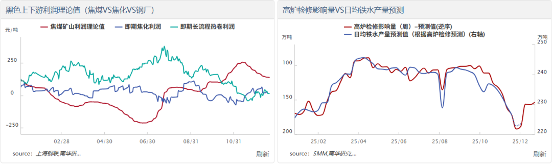 因亏损加剧及需求季节性走弱,高炉钢厂检修规模扩大,铁水产量自11月底起加速回落,导致焦煤焦炭供需格局由紧转松,基本面边际走弱,价格也在前高附近承压下行。整体来看,本轮以“反内卷”政策预期驱动的原料快速反弹,使利润在产业链内实现了自上而下的再分配。具体表现为:上游矿山盈利得到显著修复,但中下游焦化及钢厂利润则在成本挤压下持续收缩,利润向上游矿山集中的特征十分明显。