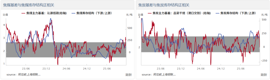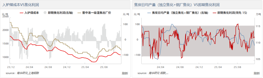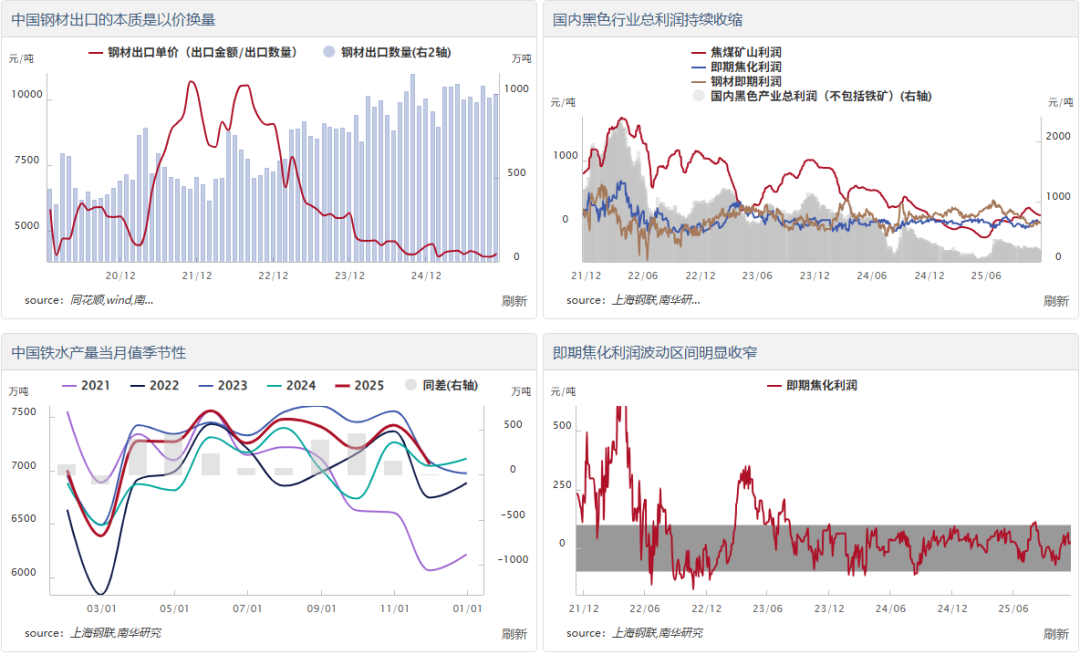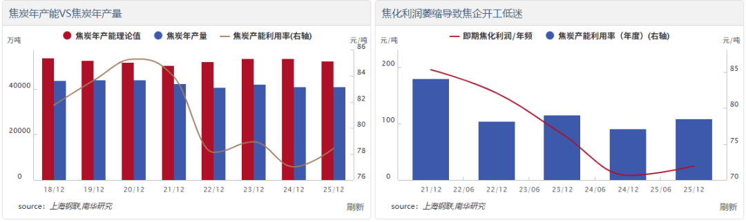 近年来,我国钢材出口虽维持高增长,但本质是内需疲软背景下,以国内黑色产业链整体利润收缩为代价的“以价换量”。上游焦煤等原料价格承压,使中国钢材成为全球价格洼地,进而刺激了钢材海外需求。因此,尽管国内钢厂铁水生产规模稳定,但在“反内卷”政策明确前,黑色系主要产品价格中枢下移,国内产业链总利润持续受到挤压。在此背景下,下游钢厂自身盈利微薄,难有充足利润向上游焦化环节转移。近两年即期焦化利润波动区间已收窄至(-100, 100)元/吨。每当利润触及区间上沿,便会受到来自下游钢厂和上游矿山的双重压力。这一现象深刻揭示了我国焦化行业在终端需求疲软与产能过剩双重约束下的现实困境。