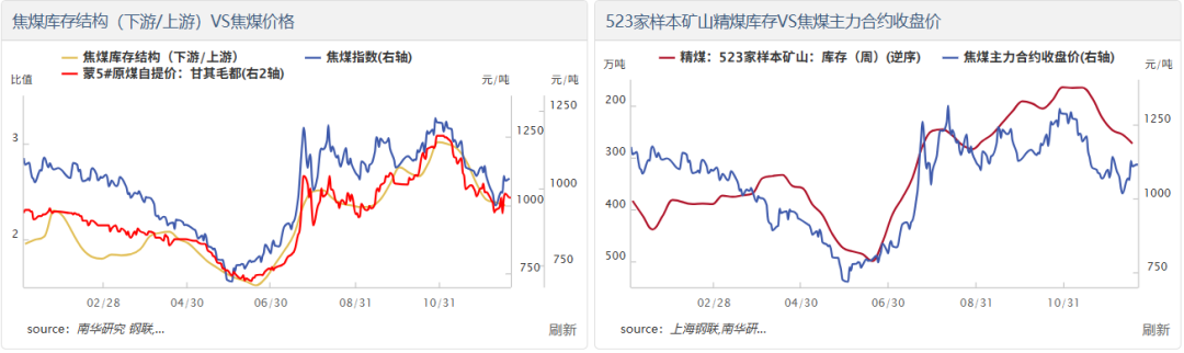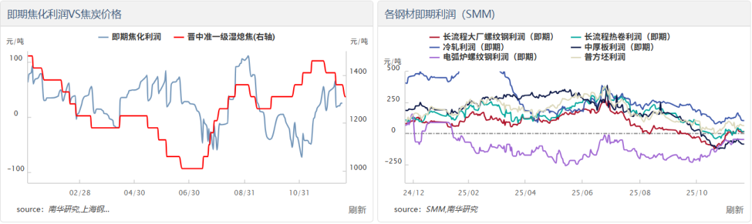 7月以来,随着“反内卷”政策预期持续升温,以多晶硅、碳酸锂及焦煤为代表的多个大宗商品板块出现联动上涨,市场波动率明显抬升。 经过持续一个季度的反弹,截至10月底,山西地区低硫主焦煤累计涨幅超500元/吨,上游矿山利润得到大幅修复。然而,焦化厂因原料库存不足,被迫采购高价焦煤,为转移成本压力,焦企积极推动焦炭提涨,持续走高的原料成本开始侵蚀钢厂利润,使钢厂环节的经营压力凸显。