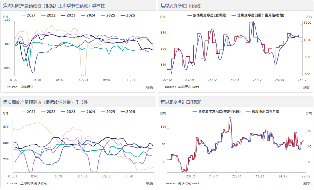【核心观点】展望2026年,国内煤焦市场将继续在“能源保供稳价”的基础上,通过“环保限产”、“查超产”、“控能耗”等行政手段约束过量供应、稳定价格预期,并为焦煤价格提供相对稳固的底部支撑,预计全年国内焦煤产量将同比小幅收紧(-0.5%)。此外,焦煤进口规模有望进一步扩张,预计全年净进口量较今年增加(+3.3%)。在总量扩张的同时,焦煤进口结构也将面临调整,具体表现为来自蒙古、俄罗斯、加拿大的焦煤进口增加,美国煤进口减少,澳煤份额则维持相对稳定。投资者需重点关注蒙煤进口规模扩大对国内焦煤供需结构的冲击,以及澳煤作为海运市场的关键定价基准,其对国内焦煤价格反弹空间的估值约束。焦炭方面,我们认为2026年焦化行业的利润修复面临双重制约。一方面,钢材出口监管趋严与“反内卷”政策共同作用,或将削弱我国钢材的国际价格优势,进而拖累短期出口增速;另一方面,国内房地产、基建等传统内需领域难有起色,黑色终端需求依旧承压。在内外部压力共同作用下,行业整体盈利前景并不乐观,预计全年铁水产量将同比微降(-0.3%)。由于钢厂和煤矿在产业链中具备更强的议价能力,焦企盈利状况难以获得实质性改善,预计全年国内焦炭供应量将同比小幅收缩(-0.2%)。整体来看,生产调控政策仍是引导明年煤焦市场走向的决定性力量,但疲弱的终端需求从根本上制约着整个黑色产业链的利润修复空间,市场难以走出趋势性上涨行情。