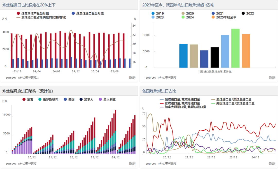 近年来,进口煤对我国焦煤供给结构的影响持续增强。2023年至今,中国年均进口炼焦煤超1亿吨,占总供应的比重高达20%。这意味着我国约五分之一的炼焦煤供给依赖于国际市场,进口已从过去的调剂补充,转变为稳定国内供需不可或缺的重要外部变量。