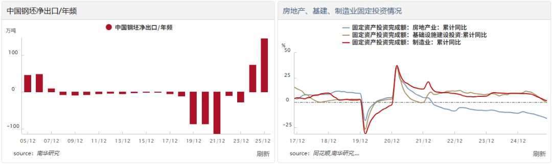 展望2026年,我们认为“反内卷”等供给侧政策可能削弱我国钢材产品在全球市场中的价格优势,进而影响到钢材出口增速。此外,商务部、海关总署联合发布公告,决定对部分钢材产品实施出口许可证管理制度,自2026年1月1日起执行。该政策预计提高相关出口企业合规成本,并直接冲击钢坯等低附加值产品的出口市场。不过,鉴于我国钢材的绝对价格优势在短期内难以被完全替代,预计全年出口规模不会出现大幅下滑,钢材出口仍将是支撑需求的重要一环。