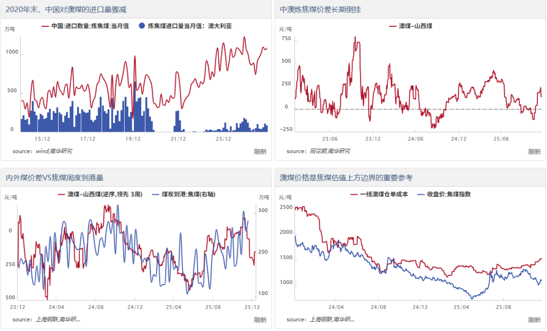 2020年末,中澳两国炼焦煤贸易中断,尽管我国于2023年3月正式解除了对澳煤的进口限制,但全球焦煤贸易格局已经重塑。目前,受内外价差长期倒挂等因素影响,澳煤进口窗口难以打开,澳煤占我国焦煤进口总量的比重已降至10%以下。尽管进口规模显著缩减,但澳煤价格指数凭借强大的市场影响力与广泛的报价参照基础,仍是影响海运炼焦煤进口的关键变量。特别是当国内煤价接近一线澳煤进口成本区间时,内外价差收窄将刺激进口窗口重新打开,进而引发市场对后续焦煤到港增量的担忧,并对国内期货及现货价格形成明显的上行压制。因此,澳煤价格指数可视为焦煤估值上方边界的重要参考。