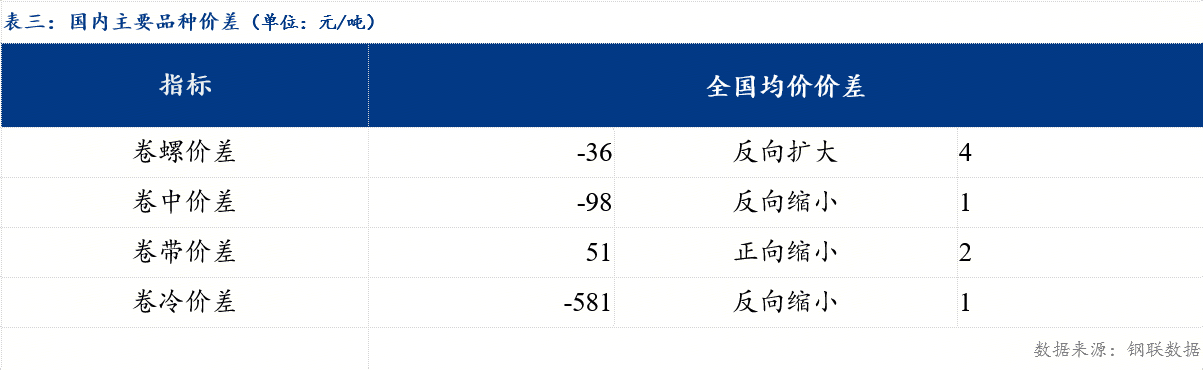 从品种价差来看,卷螺差较上一交易日反向扩大4元/吨,热中价差较上一交易日反向缩小1元/吨 ,热带价差较上一交易日正向缩小2元/吨,热冷价差较上一交易日反向缩小1元/吨。