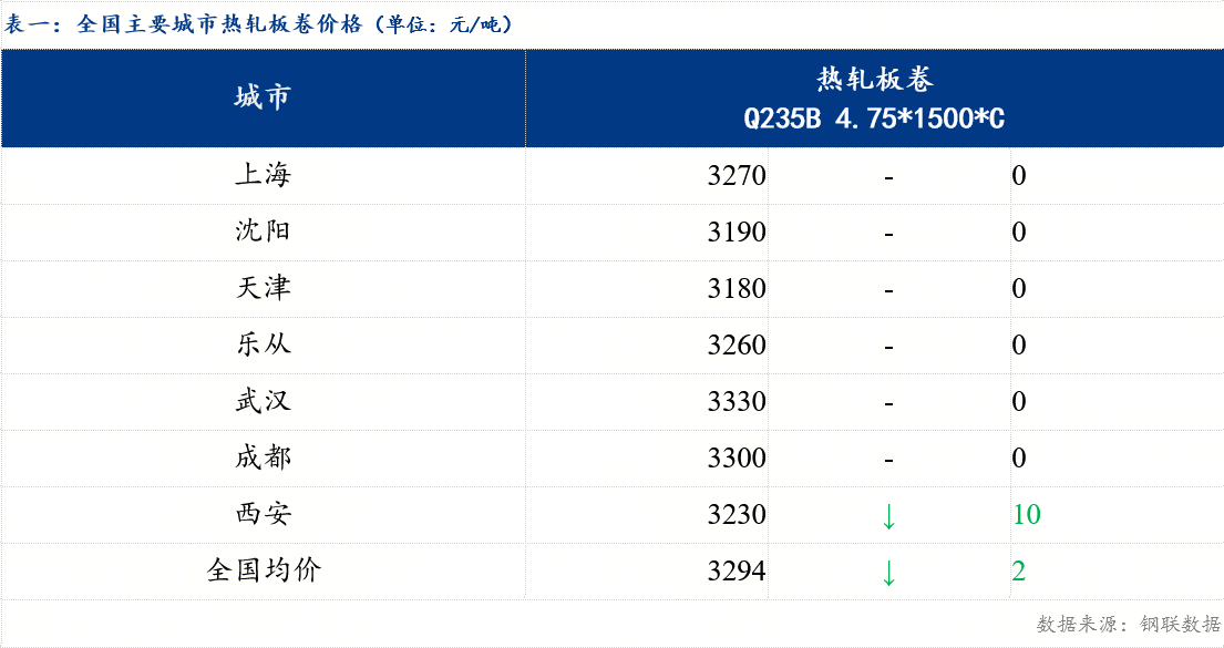 23日热轧板卷全国主要城市价格小幅下跌,午后成交转弱。截止发稿时4.75热轧板卷全国均价3294元/吨,较上一交易日下跌2元/吨。