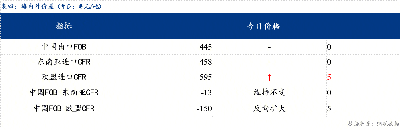 从海内外价差情况来看,中国热卷出口在445美元/吨,较上一交易日持平,欧盟进口价格595美元/吨,较上一交易日涨5元/吨。