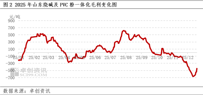 12月中旬PVC粉价格降至低位,PVC粉出口接单有所好转,且由于部分企业负荷有所下调,整体PVC粉行业库存累库进程有所放缓,PVC粉供需面略有改善,加之宏观方面存在“反内卷”消息的支撑,PVC粉价格低位回涨;而原料电石供应陆续稳定,且外采电石的PVC粉企业存在降负荷的情况,部分电石厂销售压力显现,12中旬电石出厂及送到价格出现了不同程度的下跌。PVC粉价格回涨,原料电石价格走低,加之烧碱价格跌势放缓,山东氯碱及电石法PVC粉一体化企业毛利有所改善,据卓创资讯数据统计,截至2025年12月19日山东地区氯碱及电石法PVC粉一体化企业毛利亏损收窄至-445元/吨,暂时摆脱前期低谷。