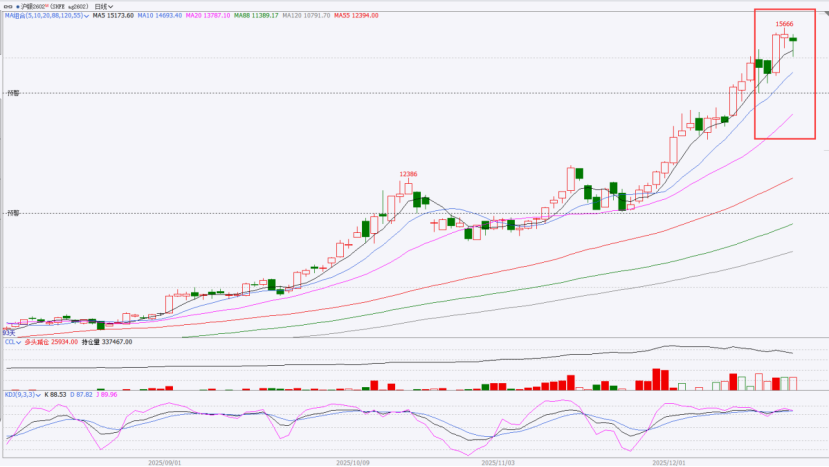 当周(20251215-1219)沪银期货主力2602合约价格高位偏强震荡。周初延续强势,于12月18日(周四)盘中最高触及15,666元/千克,再度刷新历史纪录。随后承压回调,周五(12月19日)收盘报15,376元/千克。全周来看,合约在剧烈波动中仍录得上涨,五日涨幅为3.25%。
