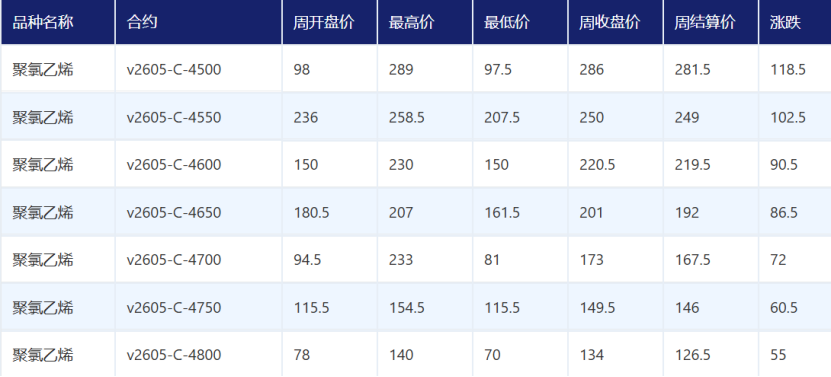 当周PVC期货持续反弹到周四,周五时结束反弹,收阴线。再次回到4600元/吨附近,截至周五收盘,主力合约V2605收盘价4652元/吨,周度上涨179点,涨幅为4%,最高价4727元/吨,最低价4477元/吨,持仓94万手,较上周增加19.2万手。成交量较上周增加234.9万手至424.5万手。