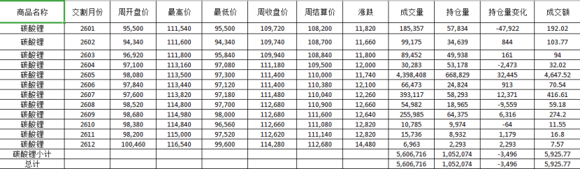碳酸锂期货周度行情,所有合约总持仓量减少3496手。碳酸锂(LC2612)合约价格114280元/吨,处于所有合约中最高,(LC2601)合约价格109720元/吨,处于所有合约中最低,合约之间最大价差4560元/吨。