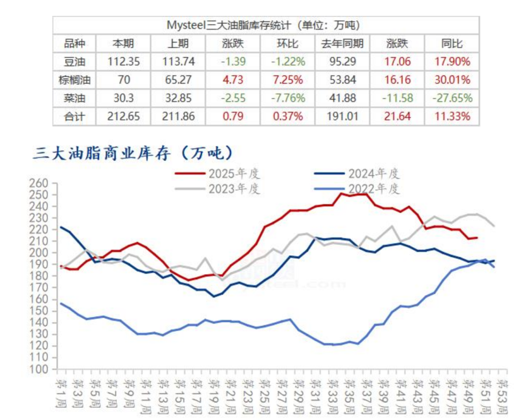 财联社鹰眼讯,据Mysteel调研显示,截至2025年12月19日,全国重点地区豆油、棕榈油、菜油三大油脂商业库存总量为212.65万吨,较上周增加0.79万吨,涨幅0.37%;同比去年同期上涨21.64万吨,涨幅11.33%。