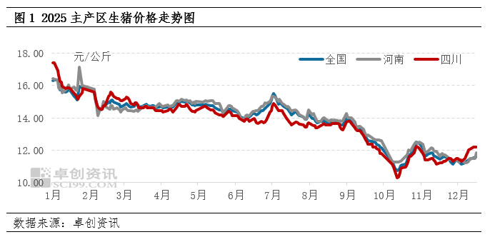 具体价格表现来看,11月20日四川价格月内低点为11.20元/公斤,低于全国均价0.35元/公斤,而截至12月17日,四川生猪出栏价为12.20元/公斤,上涨幅度为1.00元/公斤,高于全国均价0.60元/公斤。
