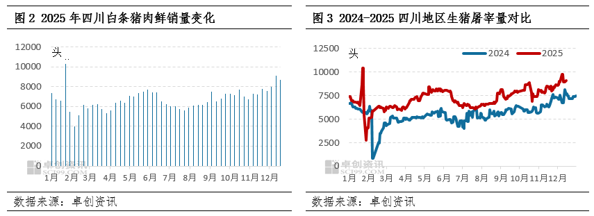 生猪屠宰量数据也可见一斑,截至12月19日,四川生猪日均屠宰量达8899头,环比增加10.40%,同比增长21.79%。对比2024年屠宰量数据来看,四川地区2025年屠宰量波动形态与2024年相仿,下半年屠宰量稳步攀升,而由于年内上游供应增加,区域内屠宰整体高于去年同期。11月中下旬之后,伴随着区域内猪肉价格的快速上涨,屠宰利润回升,屠企开工积极性提高,屠宰量增速加快。
