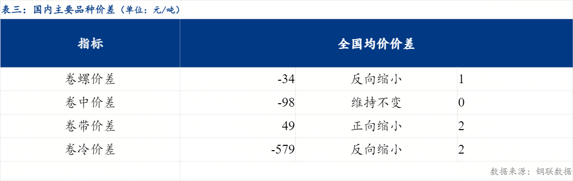 从品种价差来看,卷螺差较上一交易日反向缩小1元/吨,热中价差较上一交易日持平 ,热带价差较上一交易日正向缩小2元/吨 ,热冷价差较上一交易日反向缩小2元/吨。