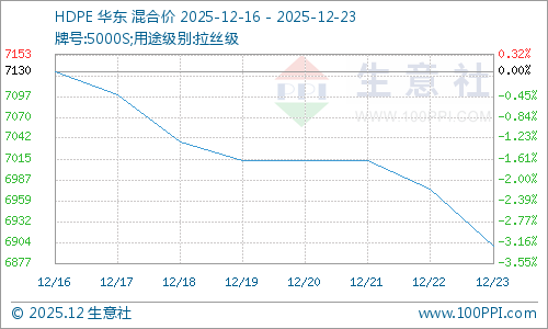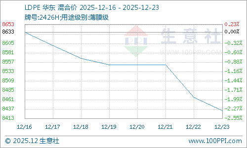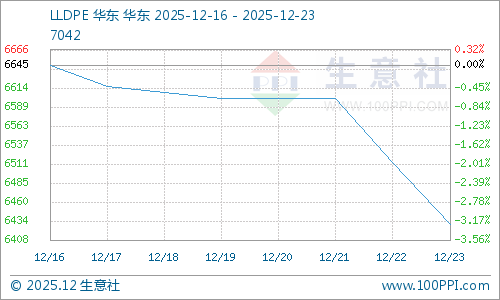 据生意社商品行情分析系统监测,LLDPE(7042)12月16日均价6645元/吨,12月23日均价在6430元/吨,下跌3.24%。LDPE(2426H)12月16日均价8633元/吨,12月23日均价在8433元/吨,下跌2.32%。HDPE(2426H)12月16日均价7130元/吨,12月23日均价在6900元/吨,下跌3.23%。