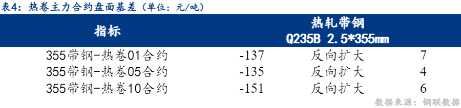 24日市场热卷05合约与唐山355带钢价差反向扩大4元/吨,热卷10合约与唐山355带钢价差反向扩大6元/吨。