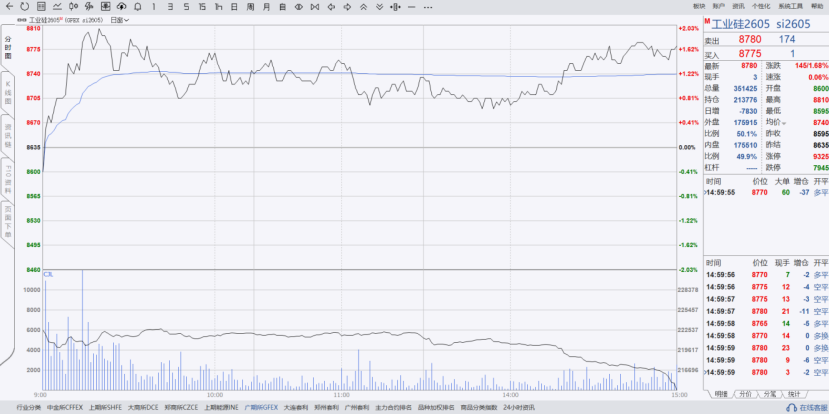 工业硅期货12个合约,品种持仓量401013手,较上一交易日减少15701手,其中活跃合约si2605,持仓量减少7830手。