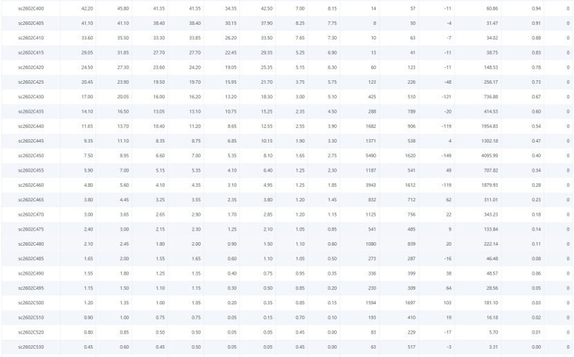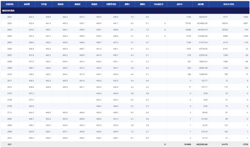 铁矿石期货12个合约,价格呈现近强远弱的反向市场格局。全天各合约普遍下跌,下跌幅度在1点到3点之间。品种持仓量928049手,较上一交易日减少6125手,其中铁矿石i2601合约持仓量减少最多,减少9584手。