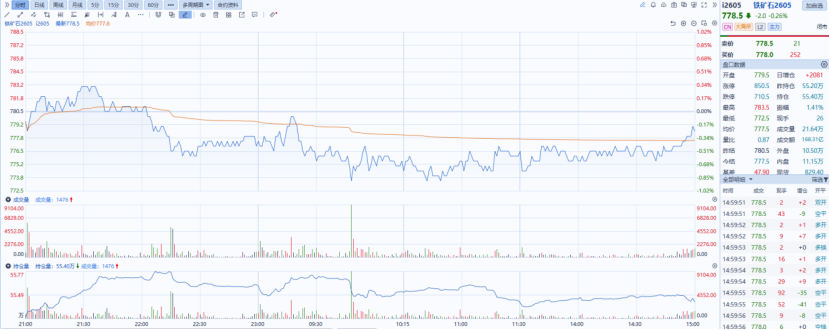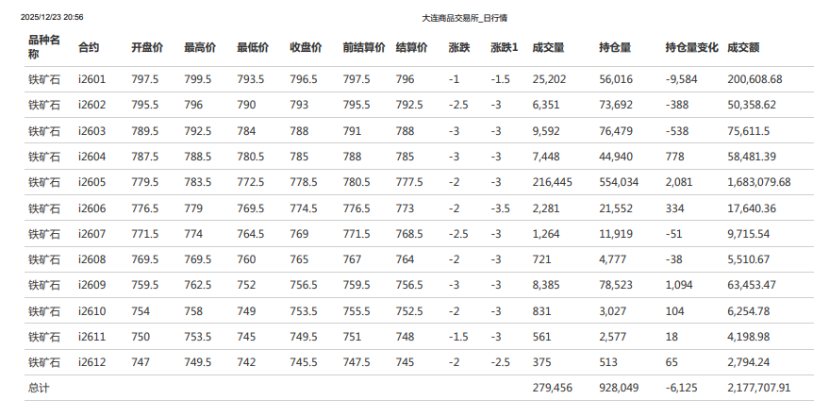 当日(20251223),期货品种铁矿石i2605合约呈现震荡走势,最低跌至772.5点,最高上涨触及783.5点,收于778.5点,跌幅0.26%。成交量21.64万手,较上一交易日减少4.82万手。持仓量为55.4万手,较前一交易日增加2081手。