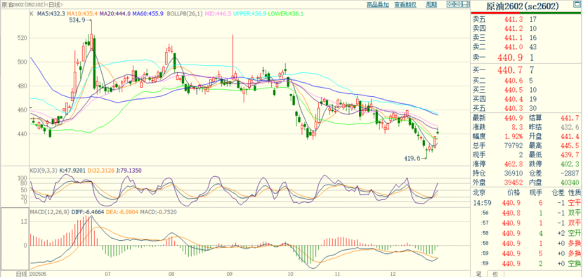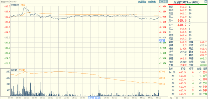 当日(20251223)原油期货价格延续震荡上行态势,主力合约SC2602收盘报440.9元/桶,较上一交易日上涨1.92%。全日成交量达7.97万手;持仓量小幅收缩至3.69万手。