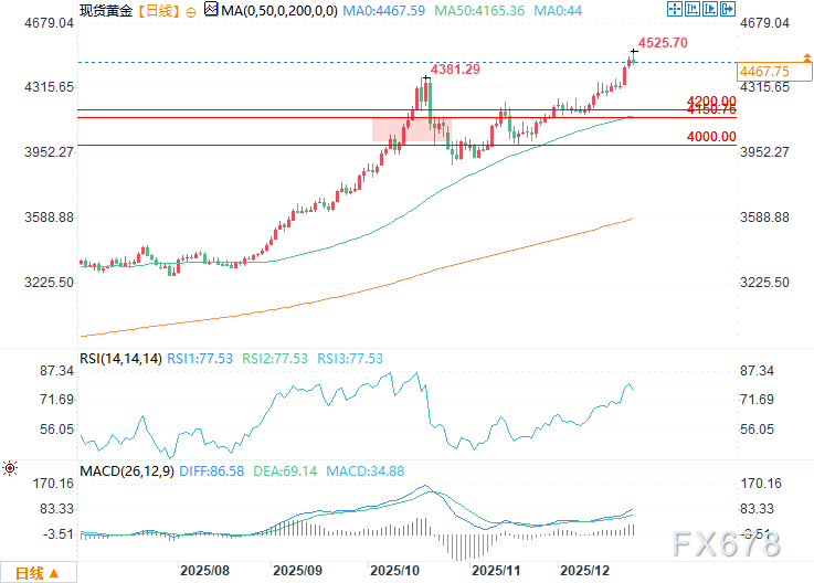 汇通财经APP讯——周三(12月24日)美盘时段,现货黄金在盘中触及4526.15美元的历史新高后,自高位小幅回落。当前价格走势或形成看跌的收盘反转顶部形态,但考虑到圣诞节假期临近市场即将休市,此次回落更像是投资者获利了结与平仓操作,而非趋势的实质性转变。今日可能出现“创高收低”的走势,但需下一个交易日进一步确认,才能判定趋势真正反转。