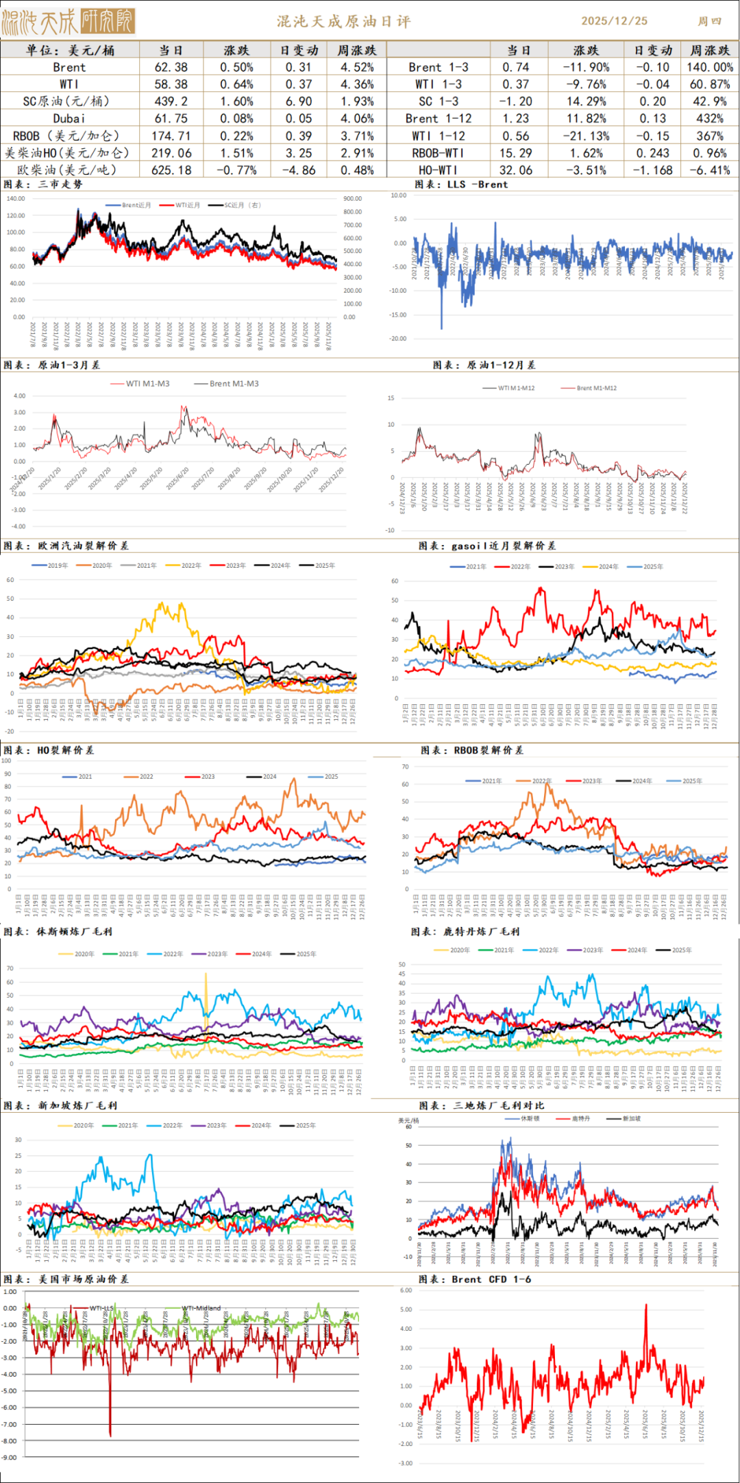 库存价差:截至12月19日,API原油库存上升239万桶,汽油库存上涨109万桶/日,馏分油库存上涨69万桶/日。