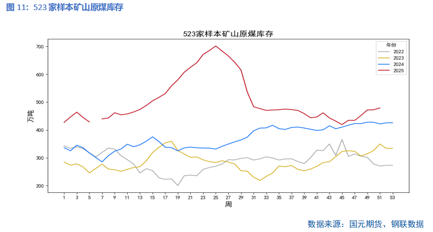 上周,247家钢厂焦煤库存为804.99万吨,周环比增加1.30%;270家独立焦化厂焦煤库存为1036.29万吨,周环比下降0.10%;港口焦煤库存为307.5万吨,周环比下降6.94%;上周,矿山精煤库存为272.77万吨,周环比增加6.84%;矿山原煤库存为478.92万吨,周环比增加1.38%。