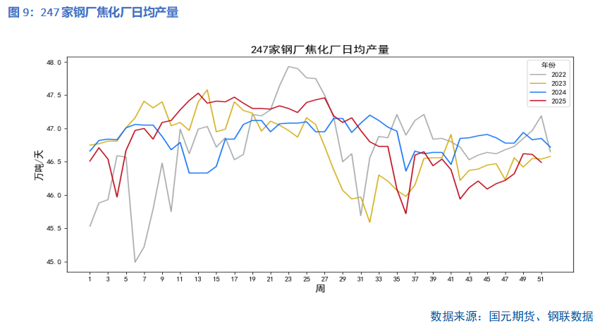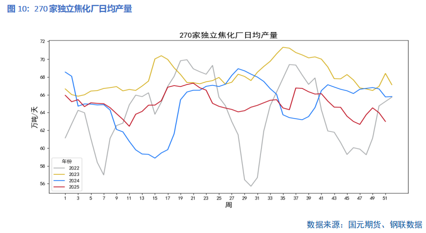 上周,230家样本独立焦化厂焦炭日均产量为49.34万吨/天,周环比下降1.97%;270家样本独立焦化厂焦炭日均产量为63.0万吨/天,周环比下降1.53%;247家钢厂焦化厂日均产量46.49万吨/天,周环比下降0.26%。独立焦化厂吨焦利润为16.0元/吨,周环比下降28.0元/吨。