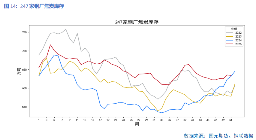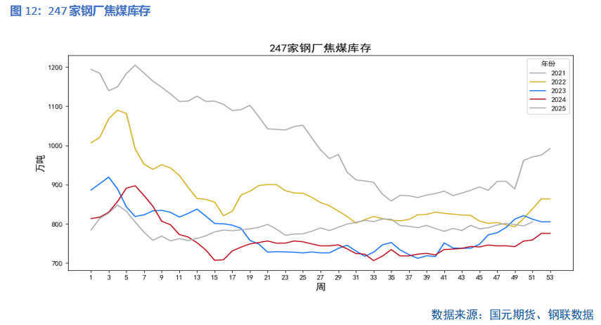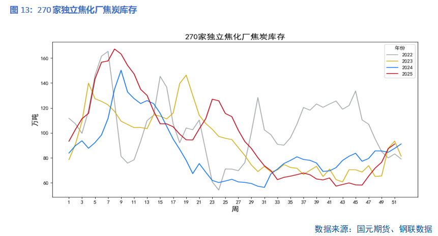 上周,247家钢厂焦炭库存为633.73万吨,周环比下降0.24%;270家独立焦化厂焦炭库存为91.1万吨,周环比增加4.33%;港口焦炭库存为175.65万吨,周环比下降3.06%。