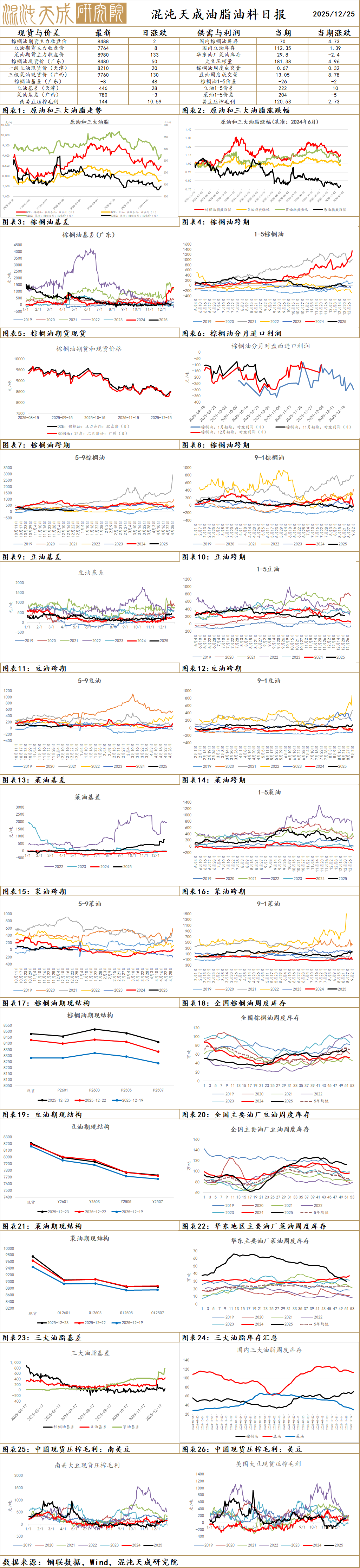 供给端:印尼总检察长周三表示,该国政府2026年可能向在森林地区非法经营的棕榈油企业和采矿者罚款85亿美元;马来西亚棕榈油协会(MPOA)公布的数据显示,马来西亚12月1-20日毛棕榈油产量较上月同期下降7.44%。其中,马来半岛产量下降11.66%,婆罗洲产量下降1.73%,沙巴产量减少2.12%,沙捞越产量减少0.75%;MPOC预计,2026年马来棕榈油出口量将增至1620万吨,由于油棕树在2025年丰产之后进入自然休整期,棕榈油产量将温和增长至1970万吨;SGS公布的数据显示,马来西亚12月1-20日棕榈油出口量为676674吨,较上月同期出口的471222吨增加43.60%;AmSpec数据,马来西亚12月1-20日棕榈油出口量为821442吨,较上月同期出口的828680吨减少0.87%;据GAPKI数据显示,印尼10月棕榈油产量为435万吨,出口量为280万吨,库存为233万吨,上月同期259万吨;MPOB报告显示,11月马棕产量193.5万吨,环比减少5.3%,实际产量稍低于预期;11月马棕实际出口121.3万吨,环比减少28.13%,机构此前预估出口143-145万吨;11月库存283.5万吨,环比增加13.04%,此前机构预估库存266-272万吨;11月马棕表需37.5万吨,环比增加32.7%,处于历史同期次高位;印尼政府正在考虑从明年起建立总计60万公顷(约148万英亩)的新棕榈油种植园,以提高产量;马来西亚贸易和行业官员:在有利的天气条件、改善的劳动力供应以及高产量的新种植园的支持下,马来西亚的毛棕榈油产量预计将在2025年首次超过2000万吨,同比增长3.4%;受有利天气影响,GAPKI预计印尼2025年棕榈油产量将增长10%;印尼林业小组计划从9月1日起,对约427万公顷(1.055万英亩)林区内未获得许可运营的矿山进行打击,工作小组已经于3月启动了所谓的“纪律行动”,打击非法棕榈油生产,并派遣军方人员接管了逾330万公顷种植园。