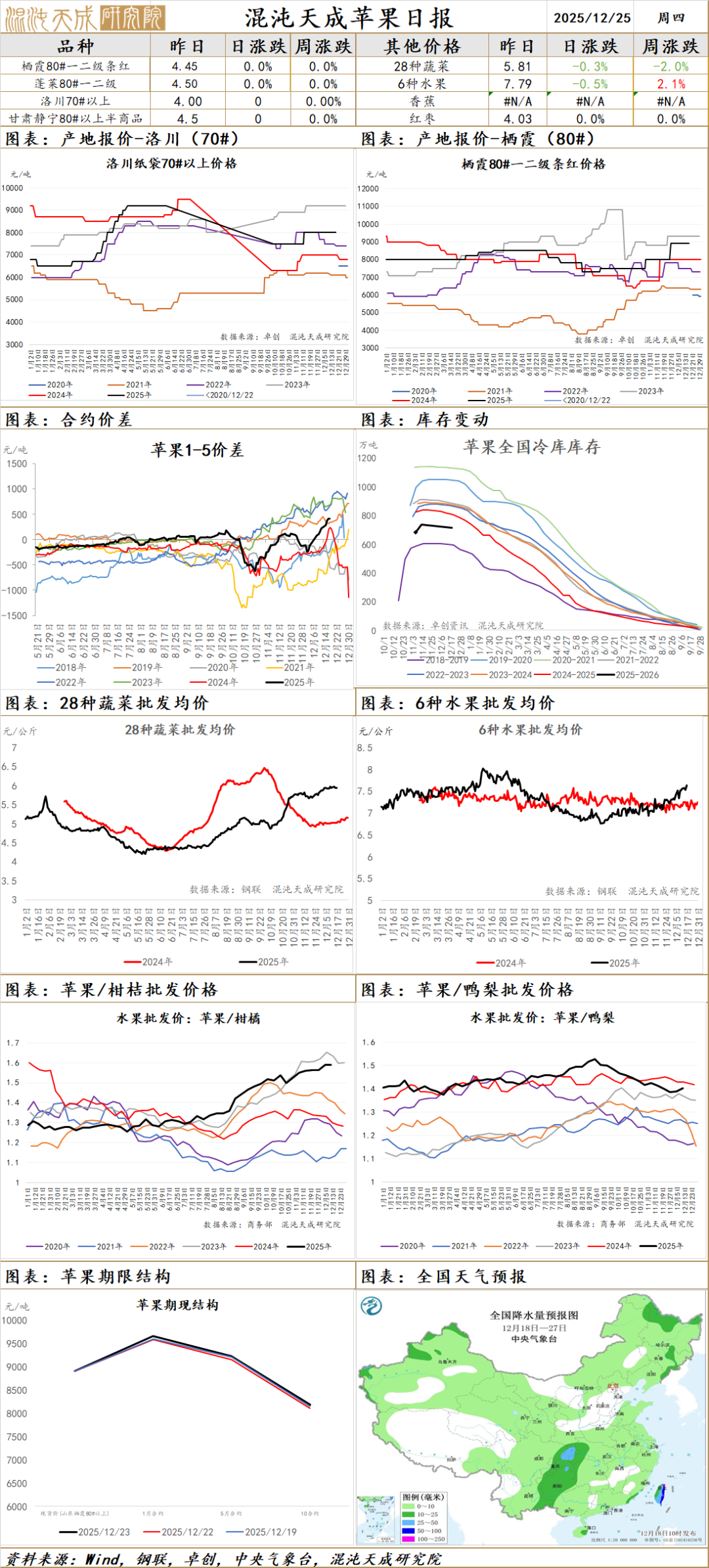 苹果:库内晚富士行情稳中偏弱,洛川果农统货价格略有松动,产区果农货成交疲软,整体走货略有好转,但未见明显加快,客商陆续包装发运自存货源;广东批发市场苹果到车量较昨日持平,槎龙批发市场到车约35车,近期市场消费略有好转,下游拿货积极性有所增加,仍以甘肃好货货源走货为主,二三级批发商按需拿货;供应端交易进入尾声,消费端表现偏弱,柑橘等水果大量上市,交割上存在反复,短期博弈仍较强,近强远弱格局延续,近期主要关注消费端表现。