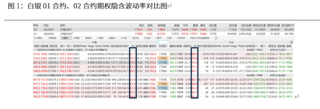 隐含波动率这几日随着标的期货的大涨,近低远高的形态得到修正:01合约隐波从38%上升到70%附近;02合约隐波从46%上升到65%。平值期权AG2601C16200从前天报告发出后夜盘的不到300元涨到今日收盘的1400元。虚值期权AG2601C17000合约从不到50元涨到685元。