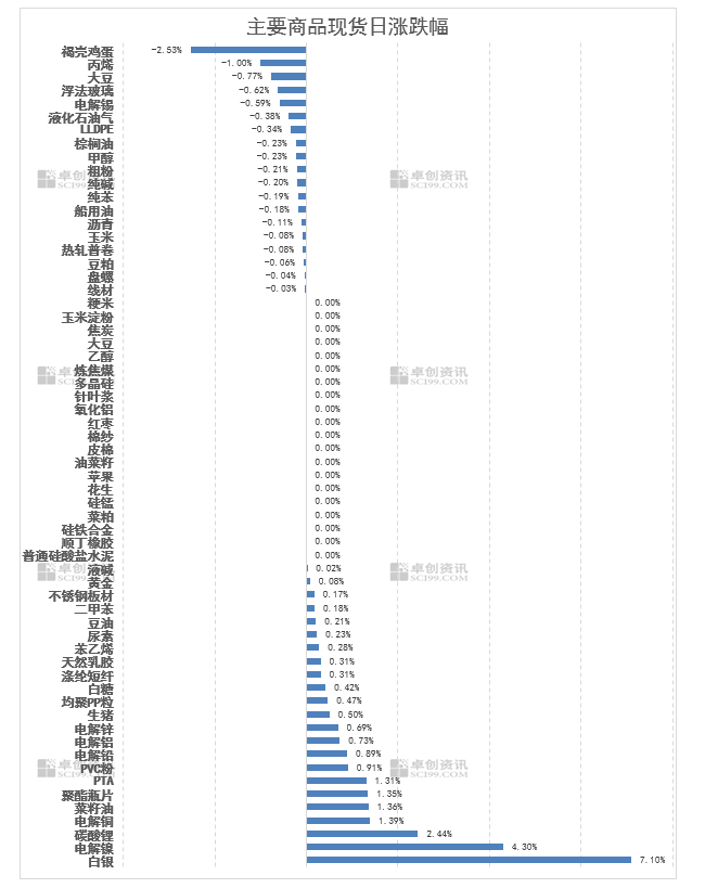 12月24日,卓创资讯监测商品现货市场23种上涨、19种下跌,20种企稳,市场整体偏暖。贵金属板块表现强势,白银涨7.1%居当日涨幅榜首,黄金微涨,板块热度持续提升;能源化工板块多数走强,碳酸锂涨2.44%、PTA涨1.31%、聚酯瓶片涨1.35%,不过丙烯跌1%领跌,板块内部分化;有色金属板块局部回暖,电解镍涨4.30%,电解铜涨1.39%、电解铅涨0.89%,但电解锡小幅下跌;农产品板块涨跌互现,菜籽油涨1.36%、生猪微涨,褐壳鸡蛋跌2.53%跌幅居前;黑色系板块多数保持企稳,整体走势偏稳。(价格涨跌幅均以卓创资讯监测现货商品均价或主流市场价格计算)