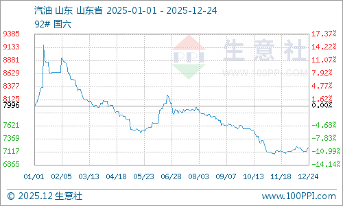 汽油:2025年国内汽油市场走势下滑,全年最低价格为11月8日的7075.6元/吨;最高价格为1月13日的9175.2元/吨,全年最大振幅达29.68%。