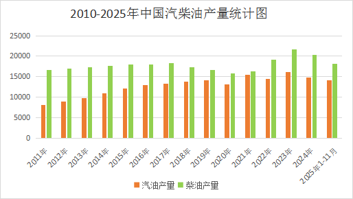 供应面:中国已成为世界第一大炼油国家,原油总加工能力约10亿吨/年。2025年成品油产量同比均有所下滑,截止11月,汽油产量为14201.6万吨,同比减少3.9%;柴油产量为18184.4万吨,同比减少2.0%;近几年中国汽、柴油产量比较如下: