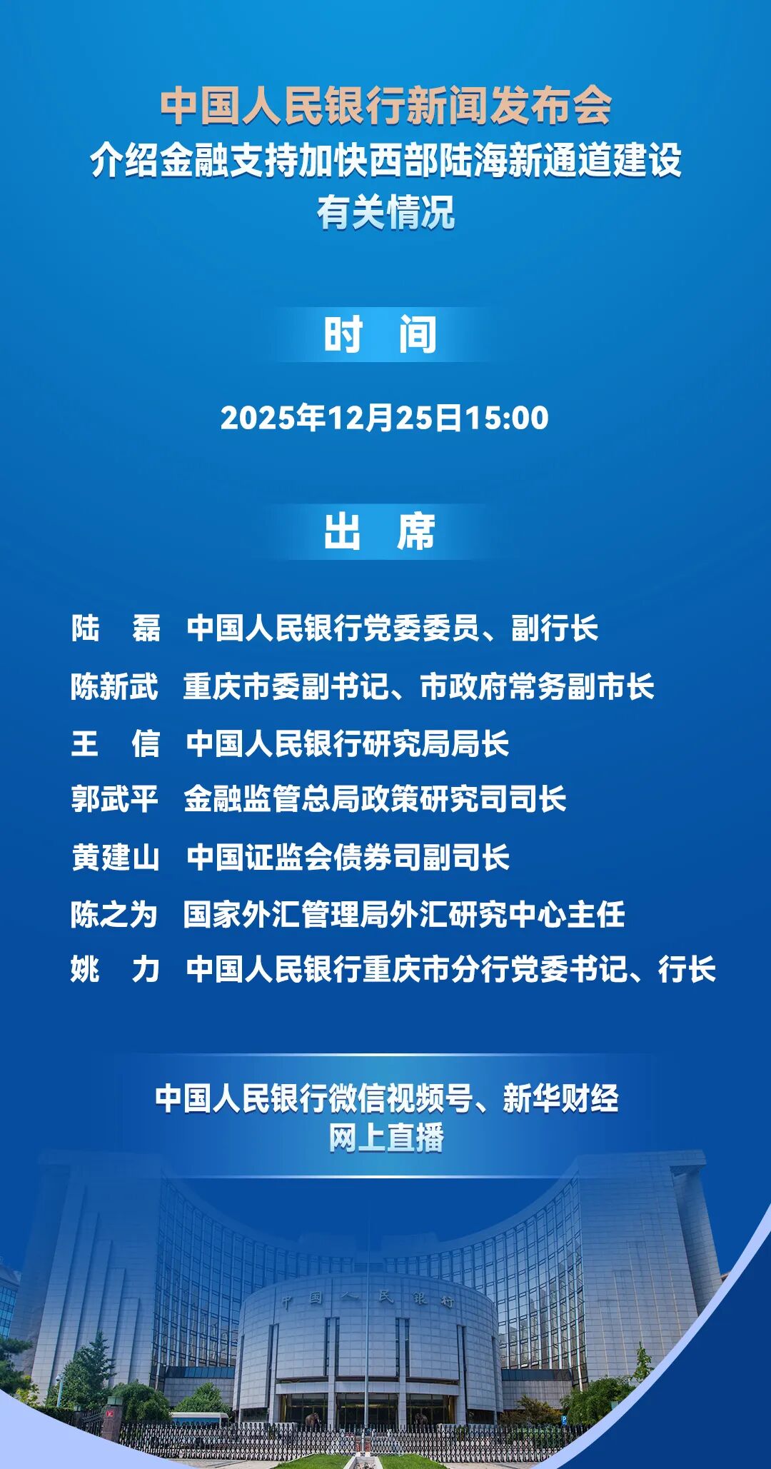 【大河财立方消息】12月25日,中国人民银行将举行新闻发布会,介绍金融支持加快西部陆海新通道建设有关情况。