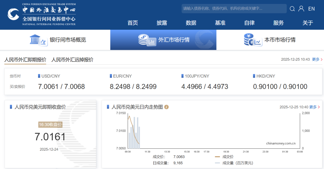 12月25日,在岸人民币兑美元升破7.01元关口,现报7.0068,创2024年9月27日以来新高。